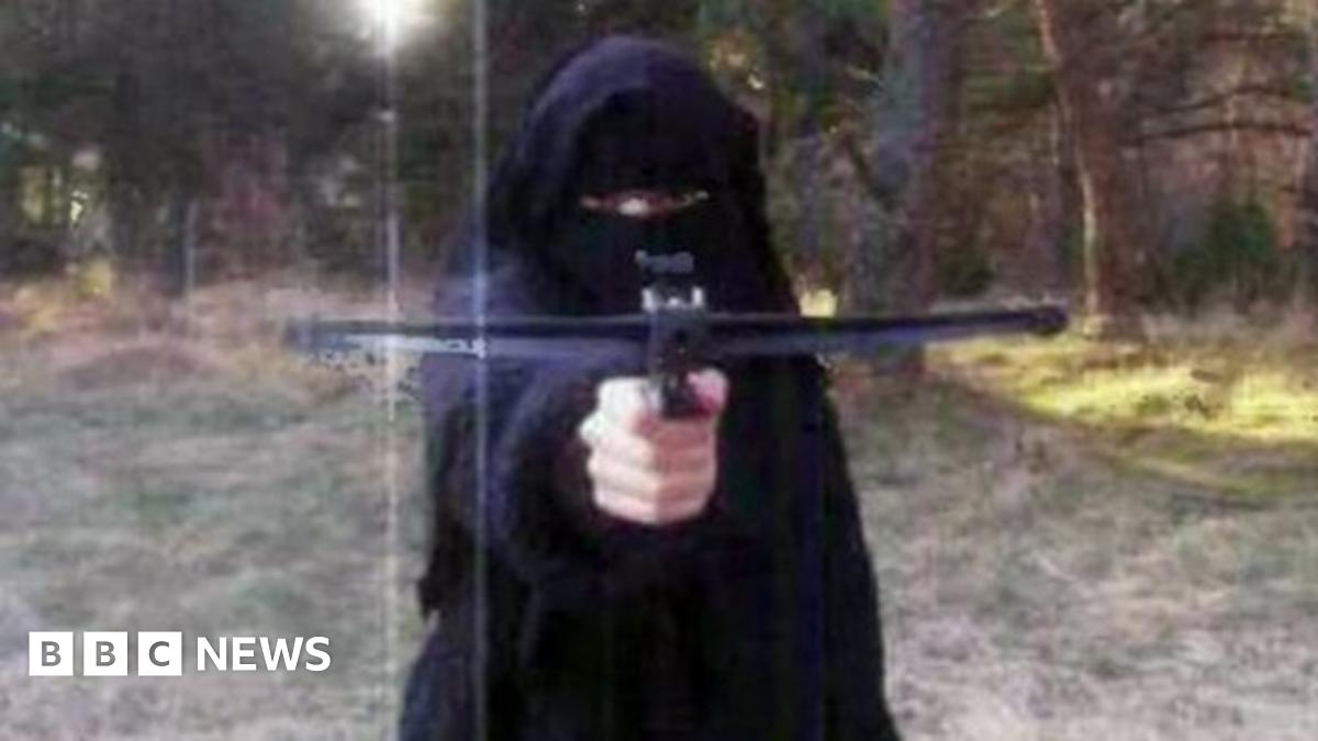 In one, she is pictured pointing a crossbow at the camera while wearing a full face veil.