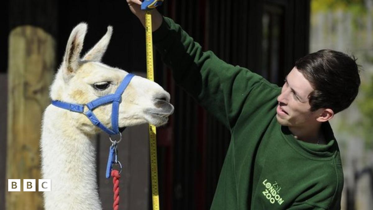 Perry the llama looks like he's behaving like a star pupil for his keeper Jack, who's measuring him.