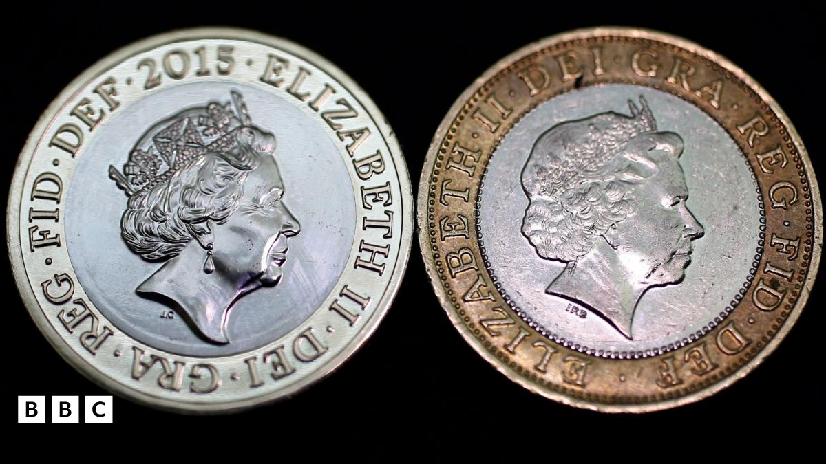 The new £2 coin design is on the left, an update of the current £2 coin (right)