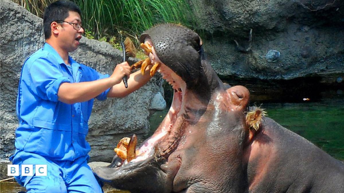 Hippopotamus has its teeth cleaned at a zoo in Japan