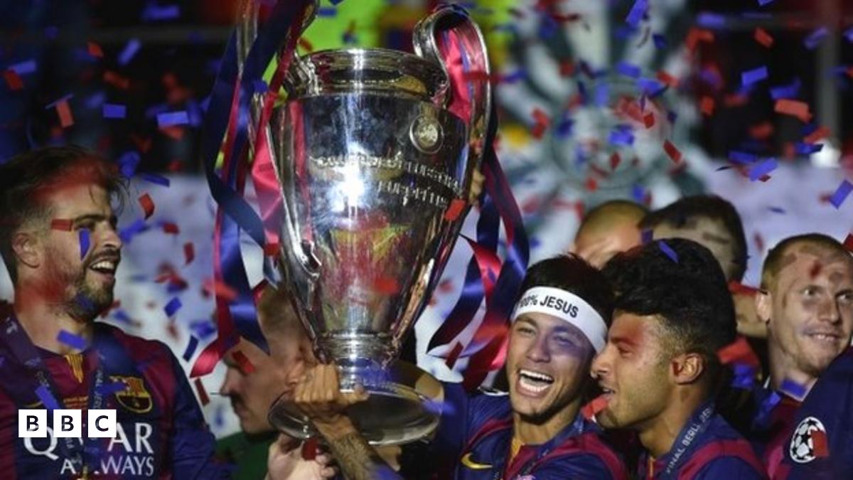 Neymar holds the trophy with Barcelona teammates as they celebrate the victory against Juventus