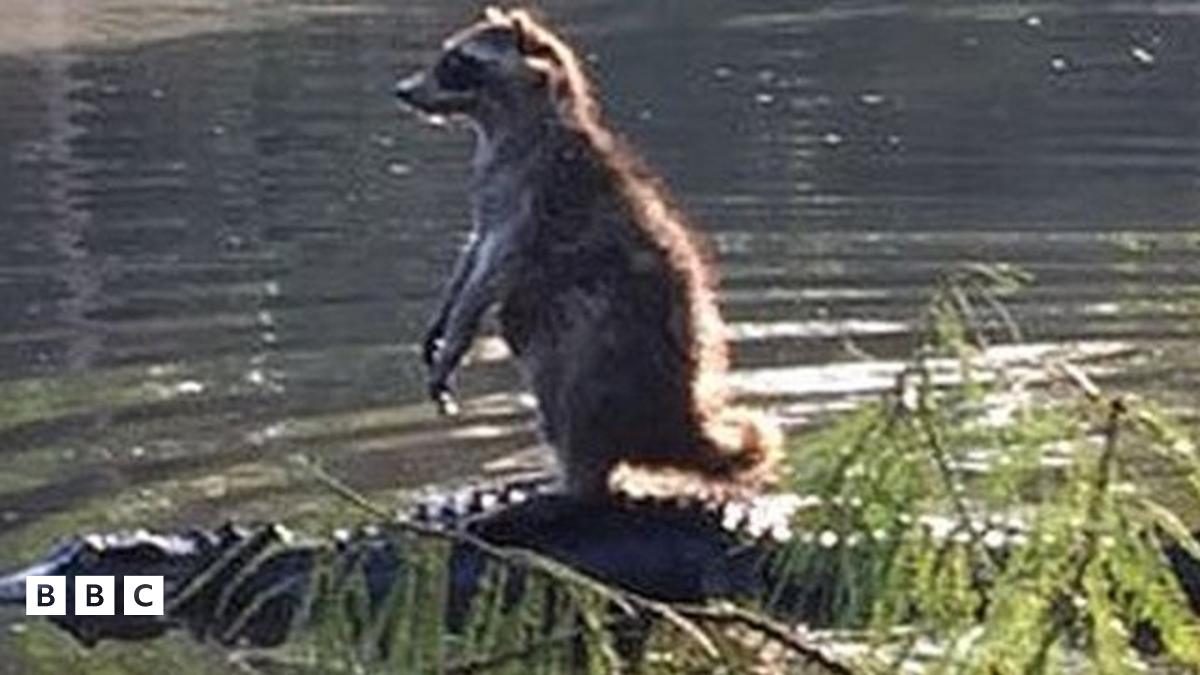 A man walking in a forest in Florida, America, has captured a rare image of a raccoon appearing to stand and ride on the back of an alligator.