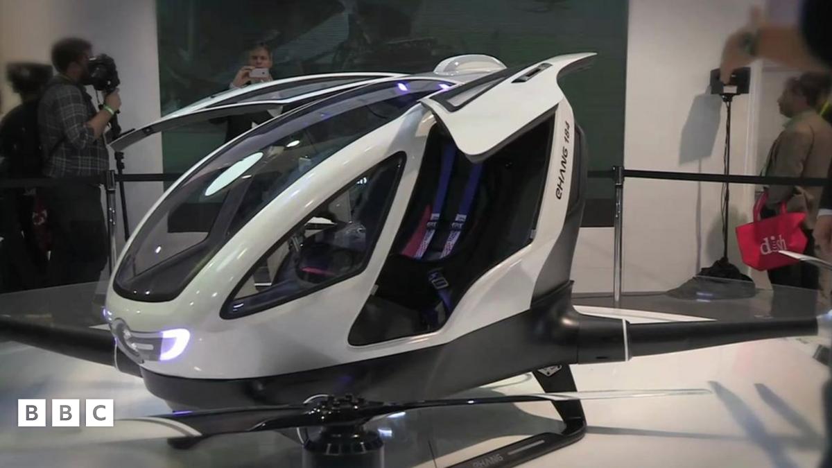 One of the latest drone prototypes on show looks a bit like a helicopter and allows a passenger to sit inside.