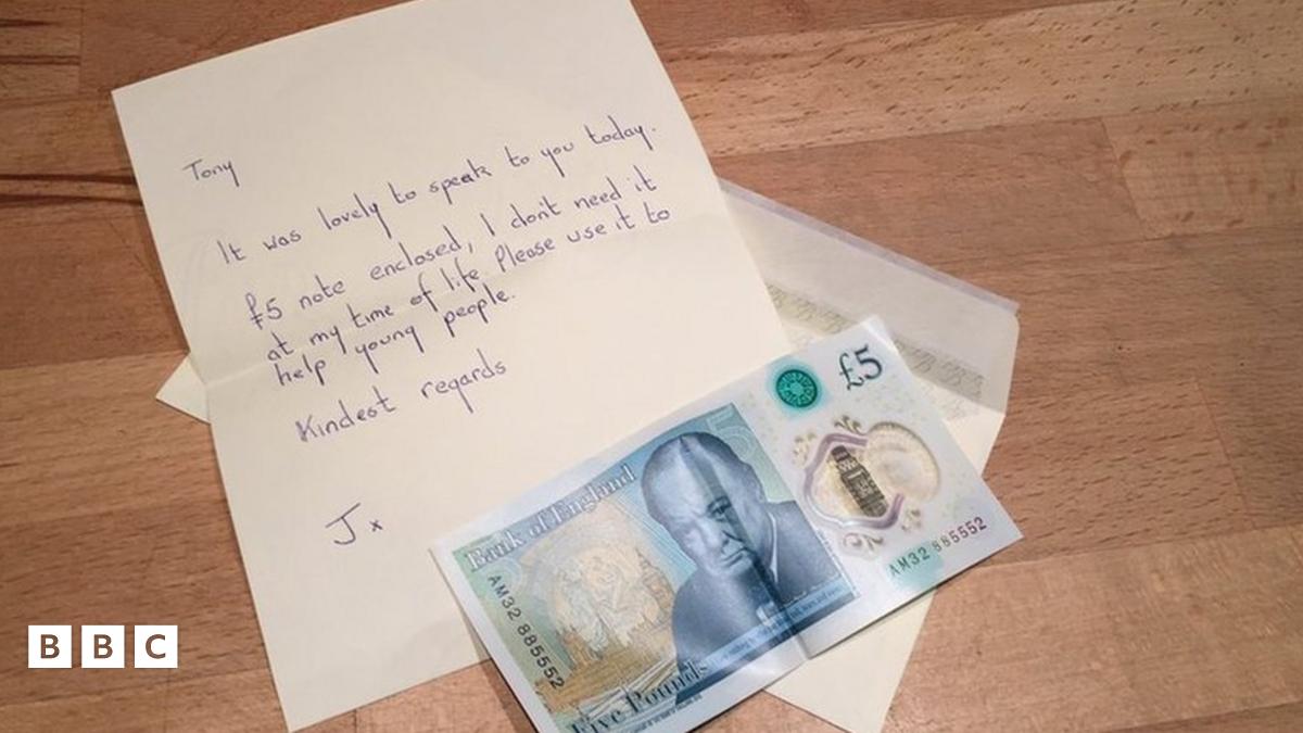 "£5 note enclosed, I don't need it at my time of life. Please use it to help young people," she wrote.