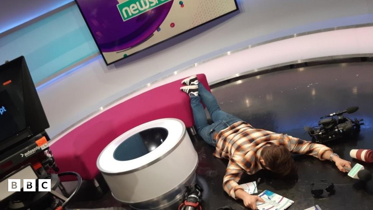 Newsround's Ricky Boleto lying down with some of the items he uses to do his job.