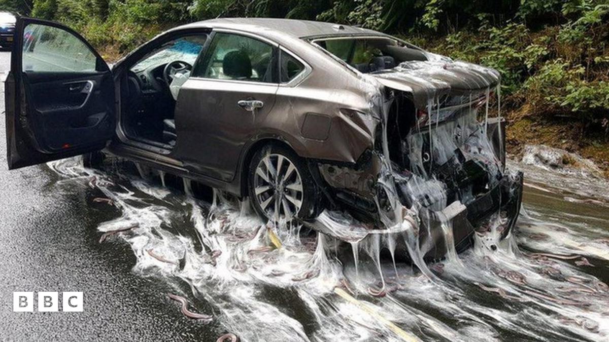 The picture above shows a slime covered car in Oregon, America back in 2017. It was covered in hagfish slime after a truck overturned on the road. The truck was helping deliver hagfish to South Korea where they are considered a delicacy.
