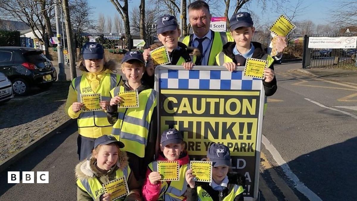 Children at one primary in Greater Manchester are now patrolling the street outside their school and giving out fake parking tickets to anyone who stops on yellow lines or with their engine on.