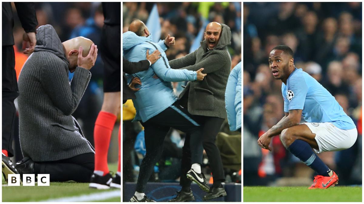 Here's Pep Guardiola and his colleagues celebrating a memorable historic last-minute goal to send Manchester City through to the Champions League semi-finals.... but hang on...