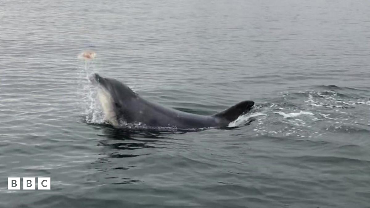 Two friends have captured footage of a dolphin tossing a jellyfish into the air with its nose close to Sønderborg harbour in the south of Denmark.