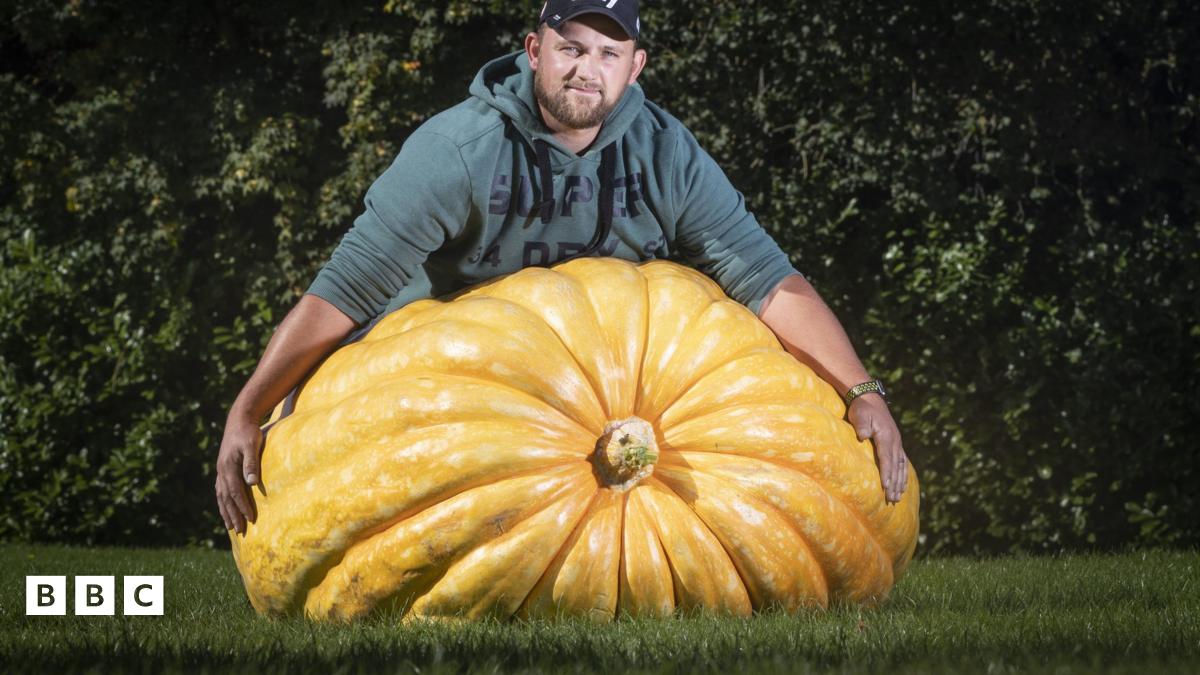 Imagine carving this whopping pumpkin at Halloween. It weighs over 290 kg and won first prize in the heaviest pumpkin category in the giant vegetable competition. Don't worry, the guy who is sat on it also grew it. Pumpkin pie anyone?