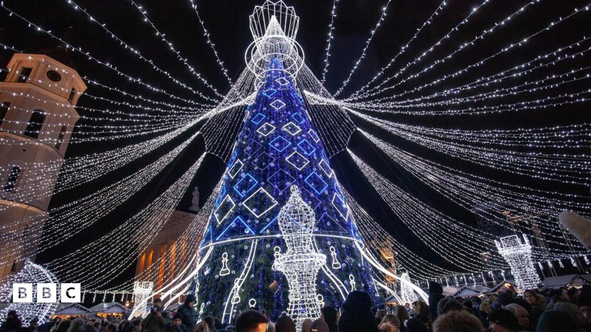 A spectacle of lights dazzled crowds as this Christmas tree in Vilnius, Lithuania, was lit up. The tree is sustainable as it's made from parts of damaged trees. In fact 6,000 of its branches come from them!