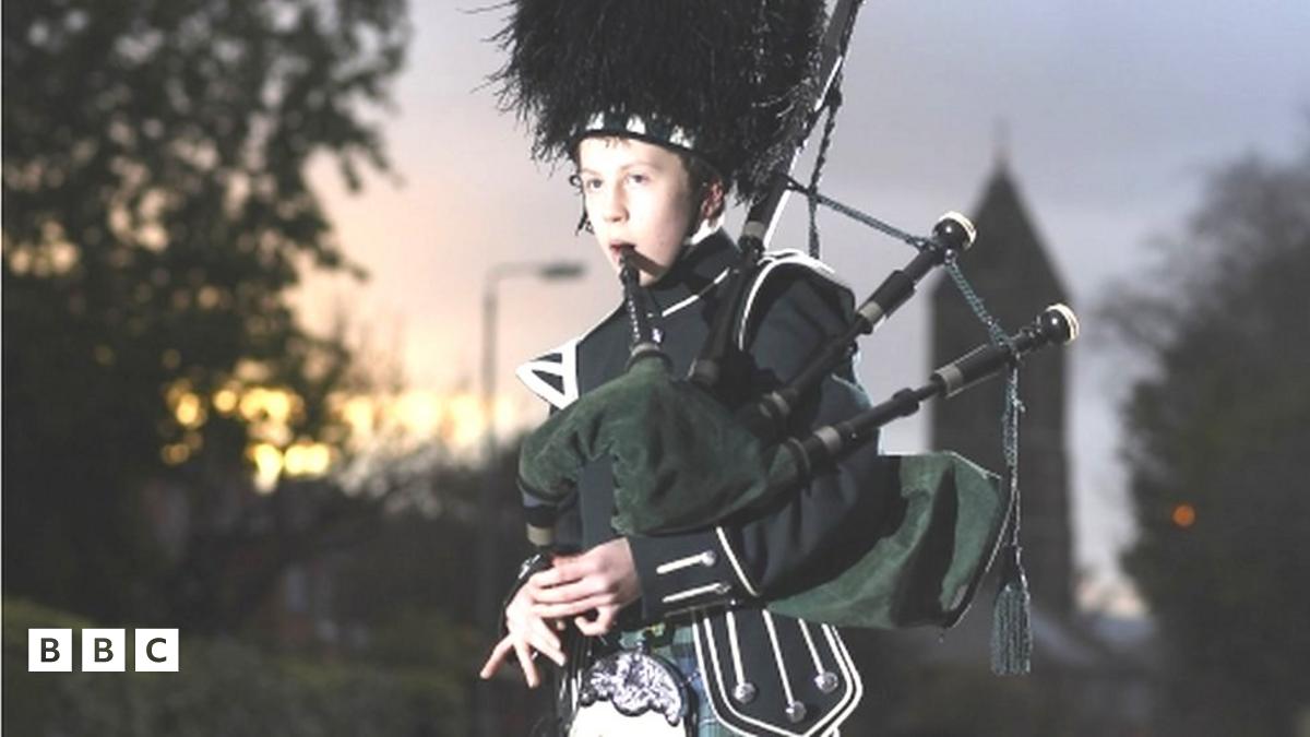 Here's 12-year-old George who's a piper, playing outside his neighbours house in Belfast.