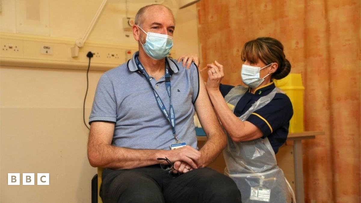 The first patient to get the Oxford/Astra Zeneca vaccine was 82-year-old Brian Pinker from nurse Sam Foster at the Churchill Hospital in Oxford.