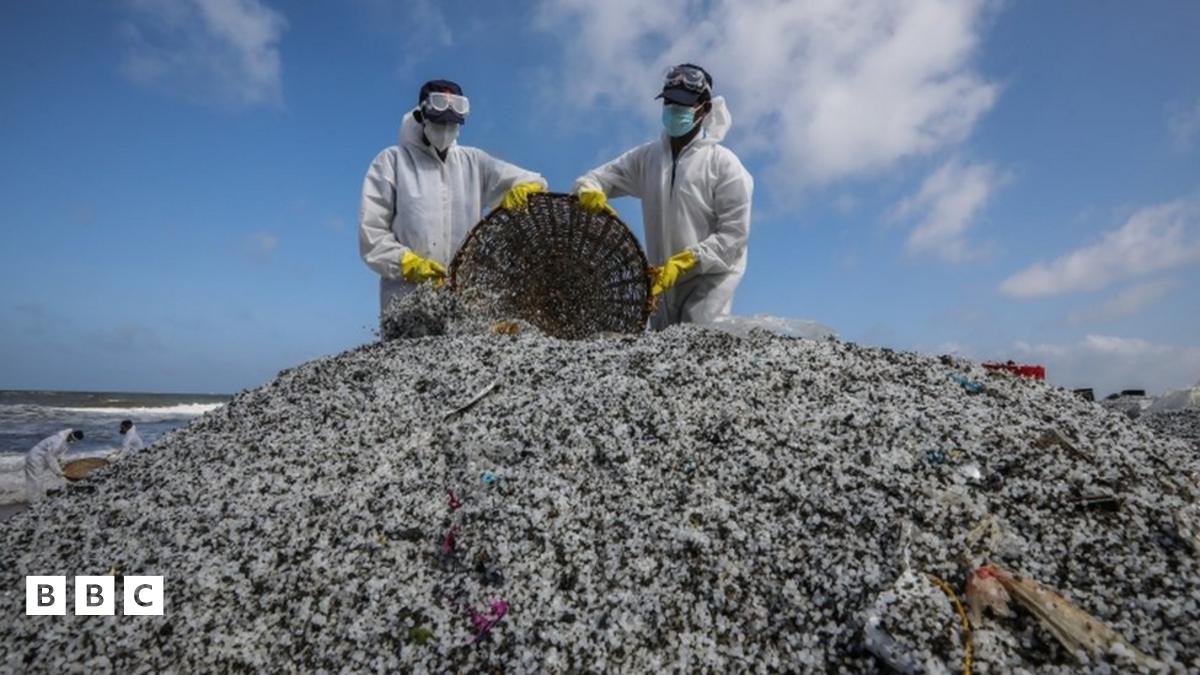 The plastic from the ship covers a 50-mile stretch of beach which residents aren't currently able to go to and fishing in the area has also been banned.