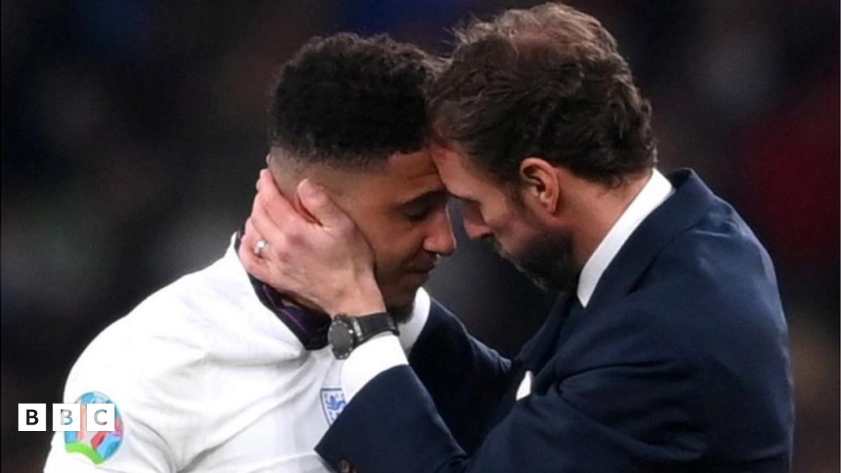 Manager Gareth Southgate comforts Jadon Sancho after his missed penalty