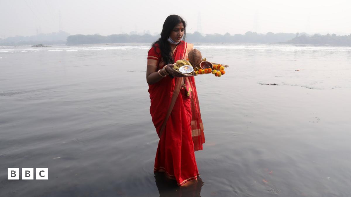 Firework displays celebrating the five day festival of light - Diwali - are thought to have contributed to the poor air quality in some of India's major cities. In this picture, a woman offers prayers in the haze during the Chhath Puja festival at the holy river of Yamuna in New Delhi. The Times of India reported that the river was full of toxic foam due to untreated sewage in the water.