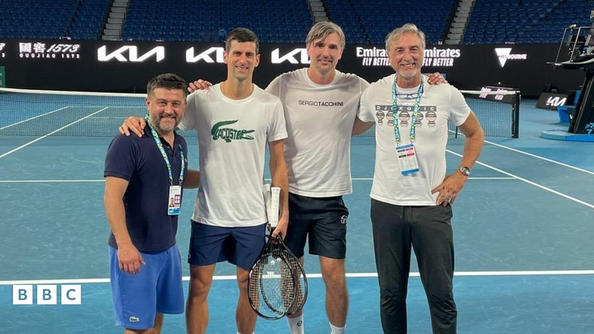 Novak Djokovic (second from left) and his training and coaching team were back on court in Melbourne on Monday