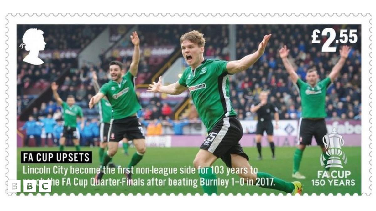 This iconic moment is less far back in history than the other - it shows Lincoln City beating Burnley 1-0 in 2017 to become the first non-league side in 103 years to reach the quarter finals. The stamps will go on general sale from 8 March 8.