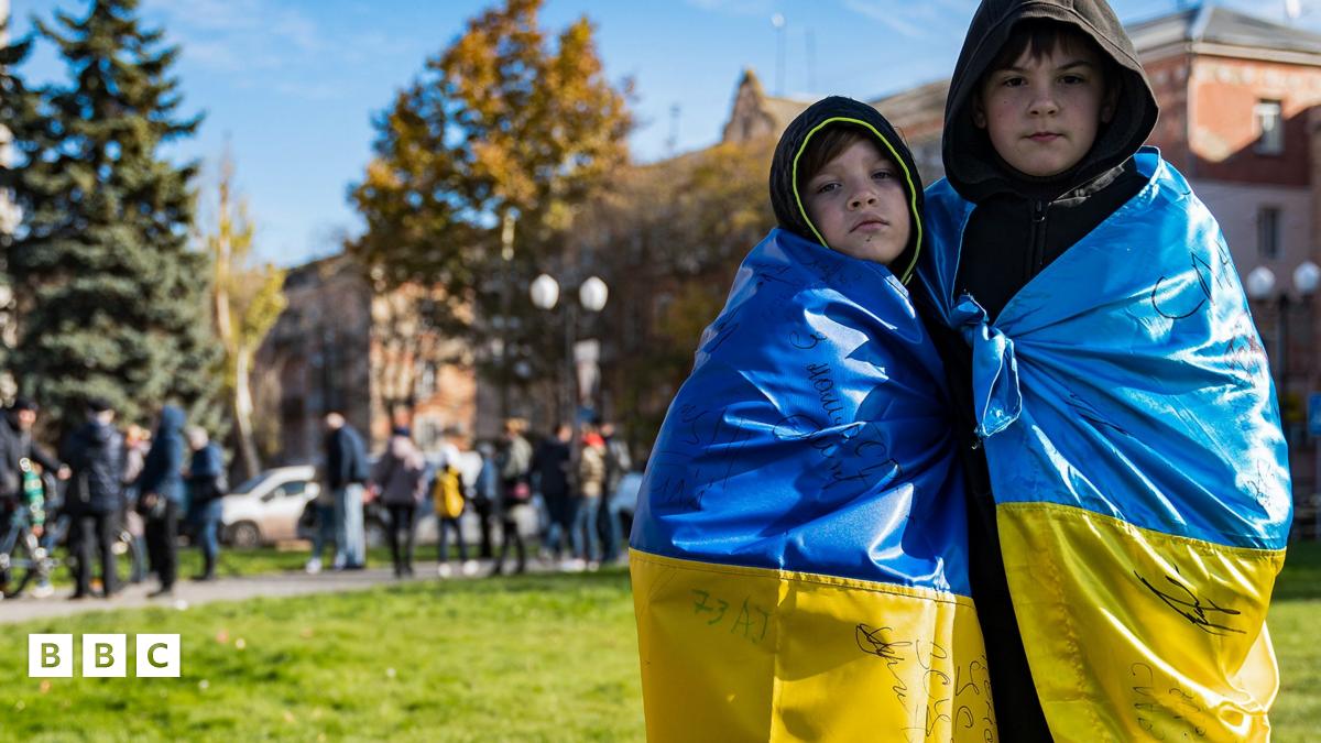 Two boys draped in Ukrainian flags celebrated last November in Freedom Square following Russia's withdrawal from the city of Kherson.