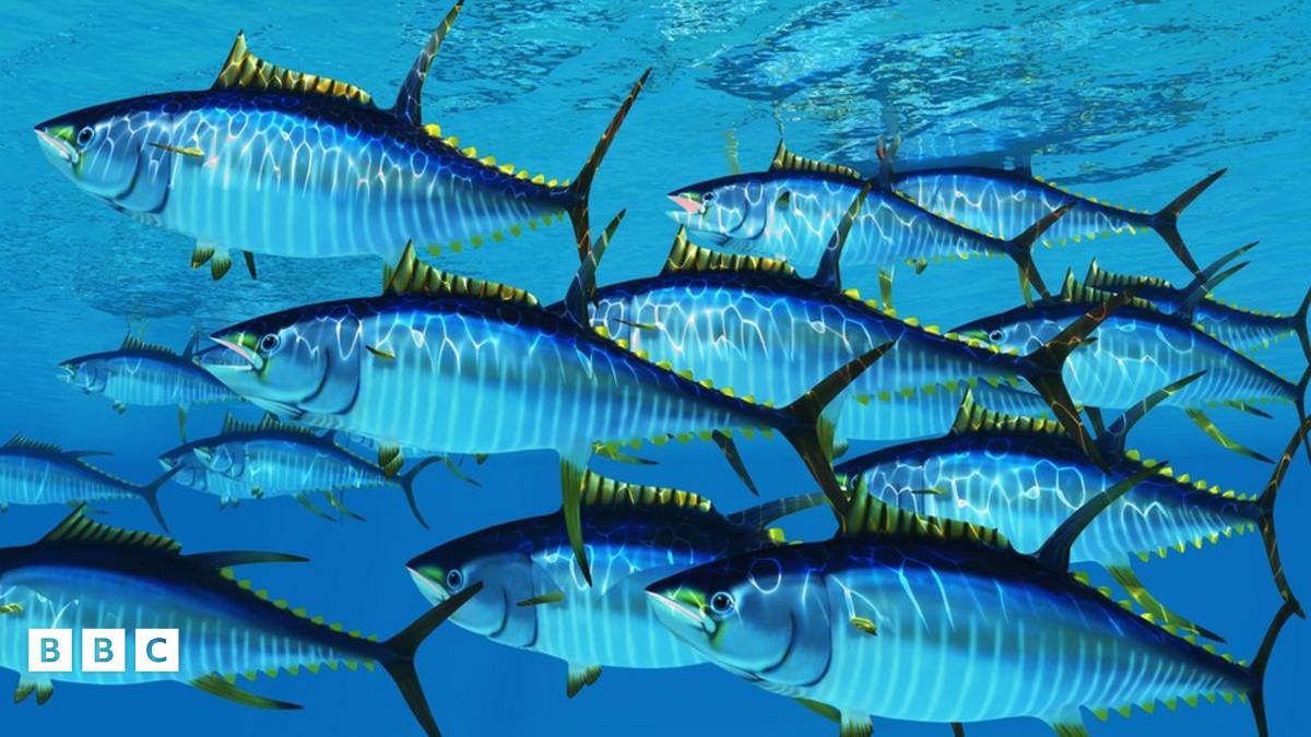 An illustration of yellowfin tuna, who migrate in big groups, which means they move from one area to another depending on the seasons