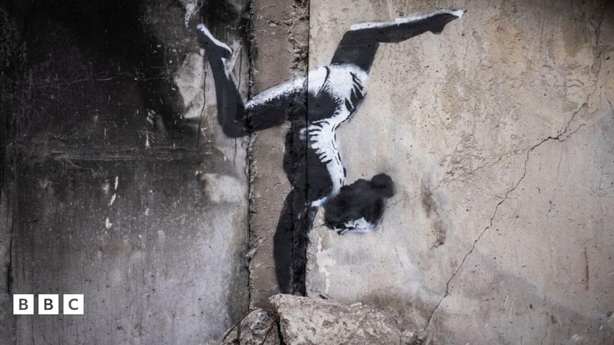 Another piece of artwork - in the trademark style seen in other Banksy graffiti - shows another gymnast performing with a ribbon on the side of a building which has a huge hole in the side of it in the city of Irpin.
