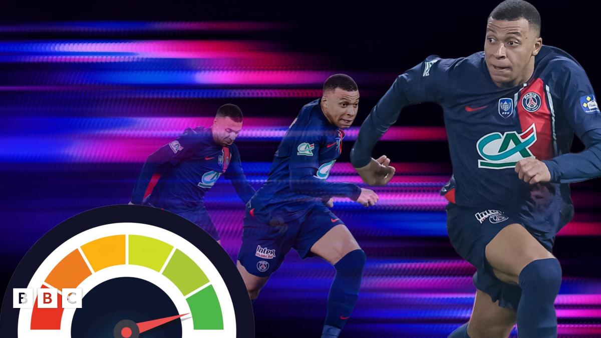 Kylian Mbappe running next to a speedometer.Image source, Getty Images