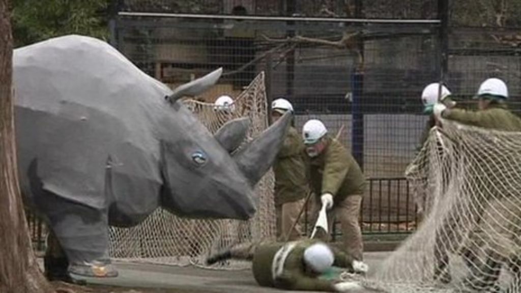 Over a hundred staff took part in this bizarre drill, which tries to recreate what would happen if a rhino escaped after an earthquake.