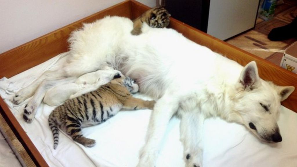 Three baby tigers abandoned by their mum at a Zoo in Russia are now being looked after by a dog called Tally.
