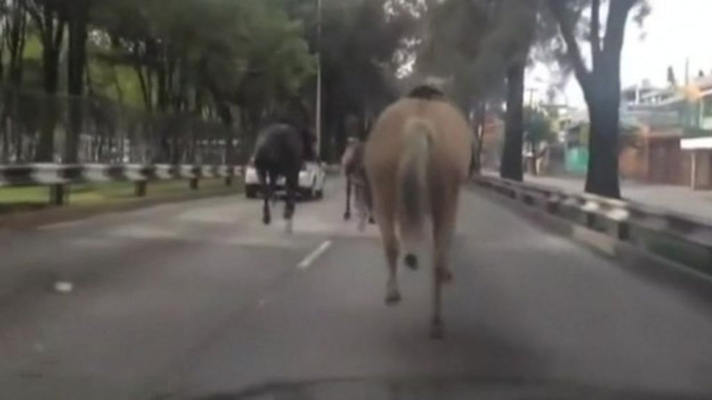 A troop of 20 police horses just took off and went on the run down the city's streets, damaging cars and street signs.