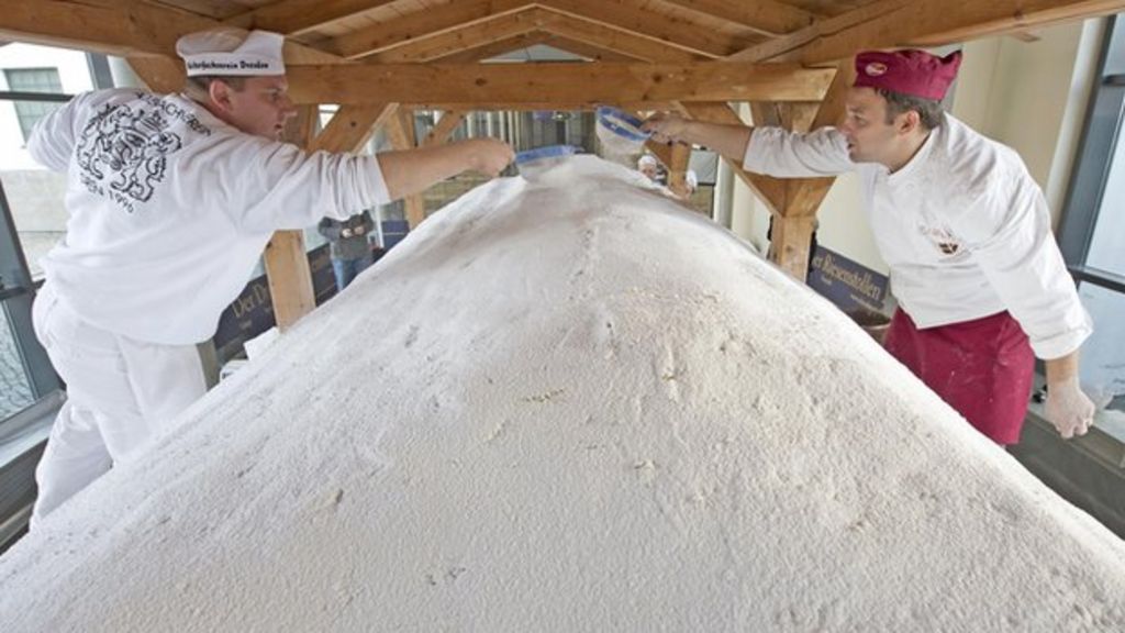 The giant cake, which is more than 4 metres long, has been made as part of a yearly festival called Stollenfest and took 66 bakers to make.