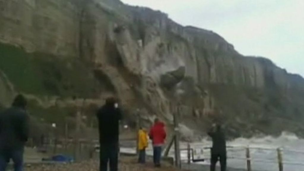 Part of a cliff near Hastings in Sussex has collapsed into the sea because of the force of the storm that has hit the UK.