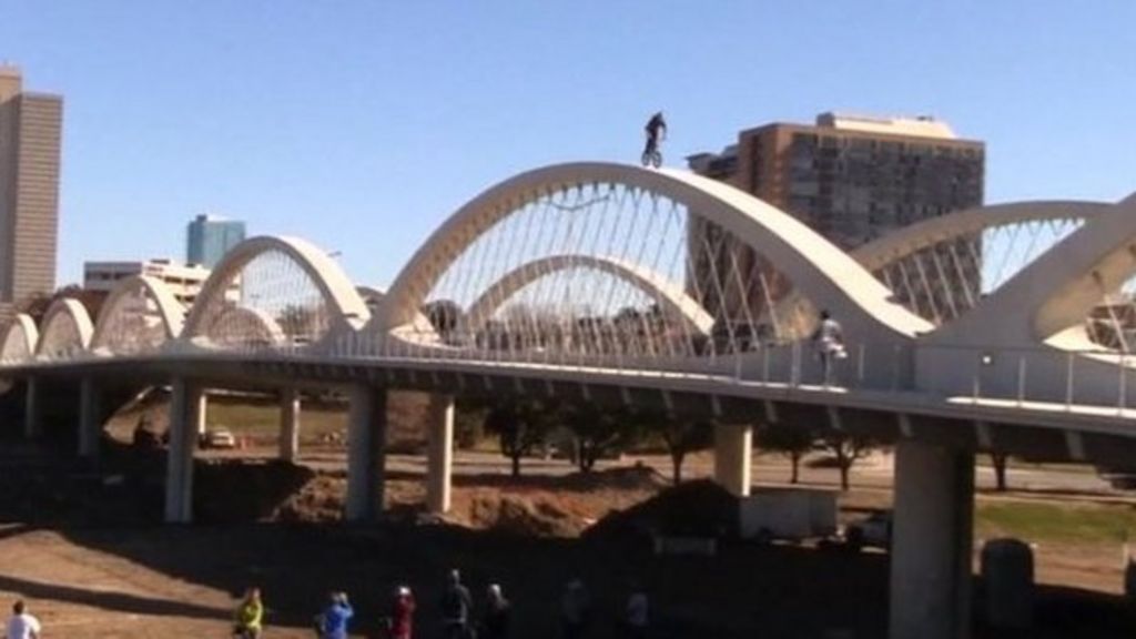 Mat Olsen wowed onlookers with his stunt ride along the top of the Seventh Street bridge in Fort Worth in Texas in America.