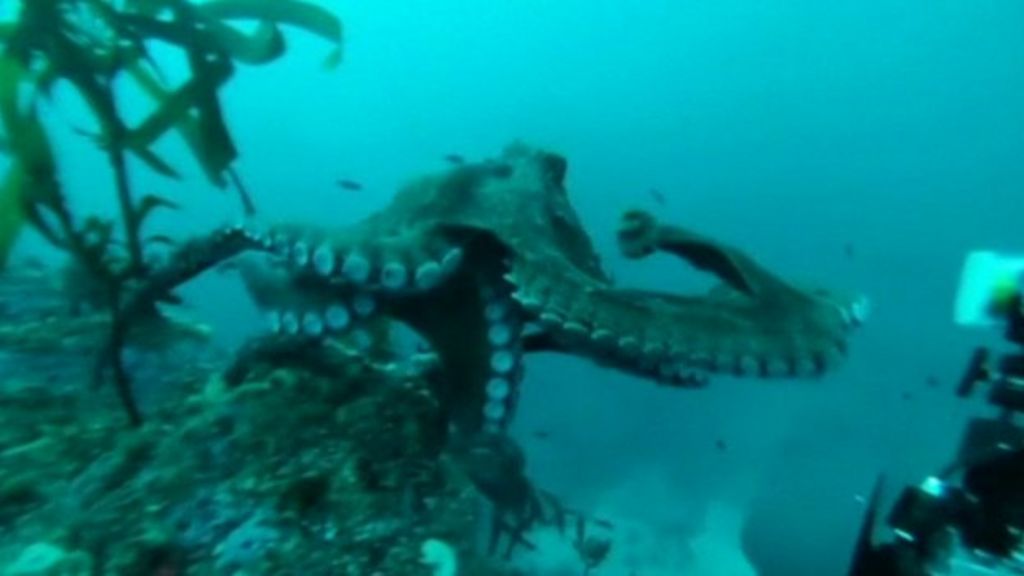 The moment an underwater cameraman got locked in a wrestle with an octopus has been caught on camera.