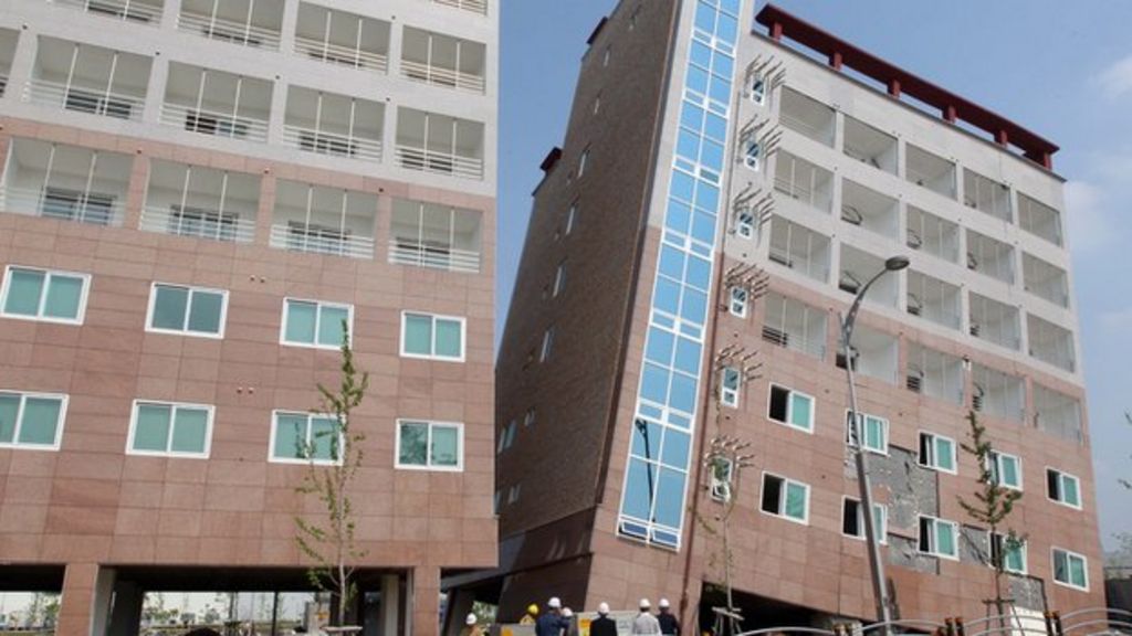 Construction workers in South Korea got a shock when one of the buildings suddenly started to tilt to one side.