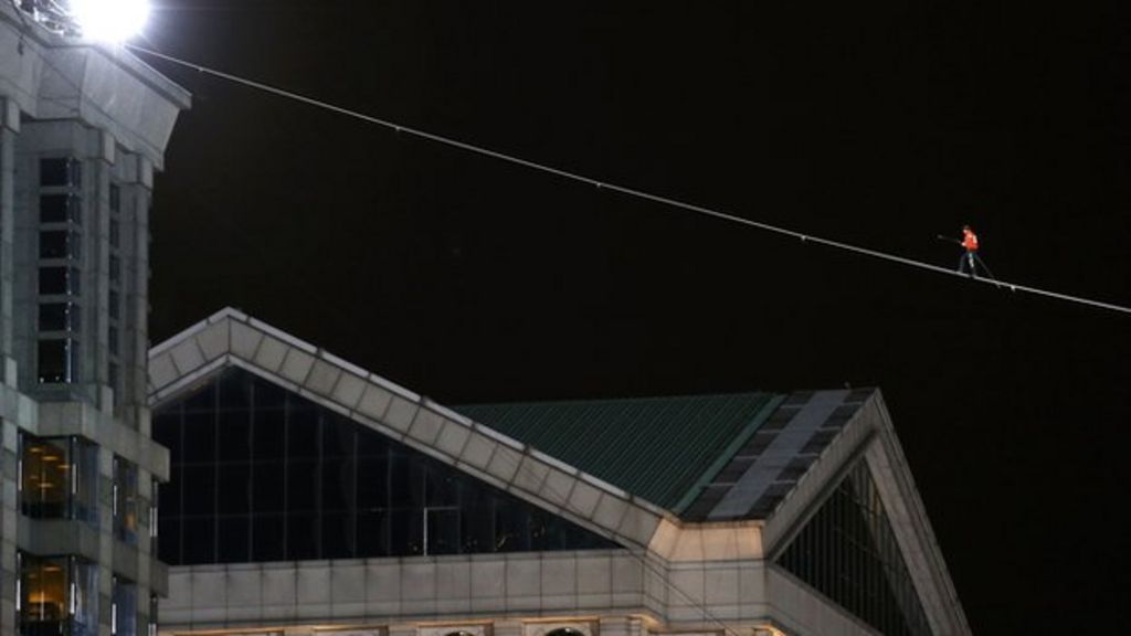Watched by thousands of people down below, he first walked up a really steeply sloping tightrope without a safety net or harness.