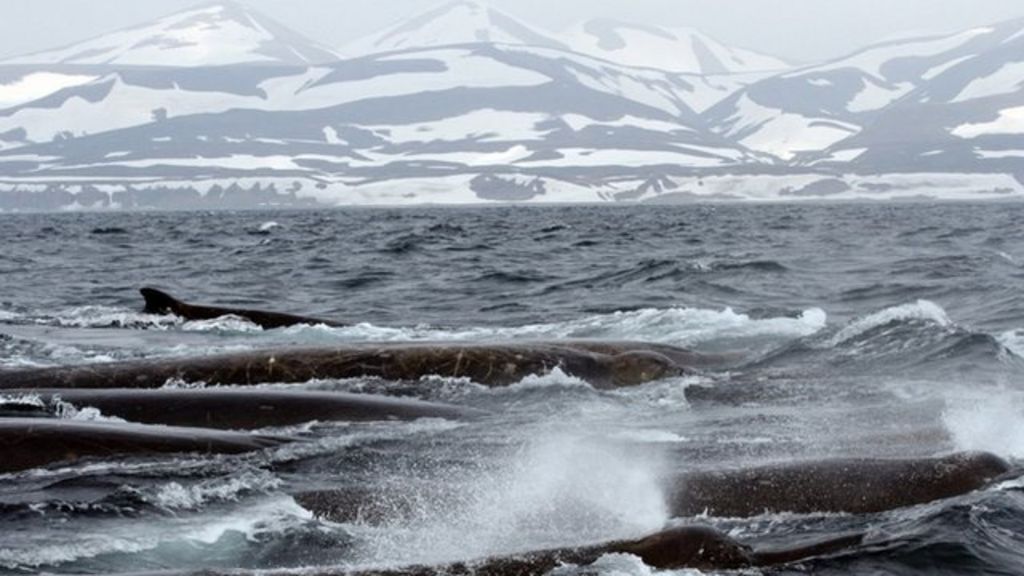 Researchers, who captured this footage in the freezing waters of Russia's Far East, identified whales by the scars on their bodies.