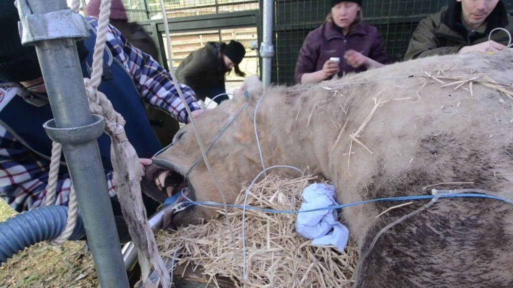 Polar bear in dentist's chair at Highland Wildlife Park