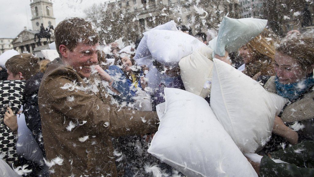 Hundreds of people have gathered in Trafalgar Square in London to mark International Pillow Day.