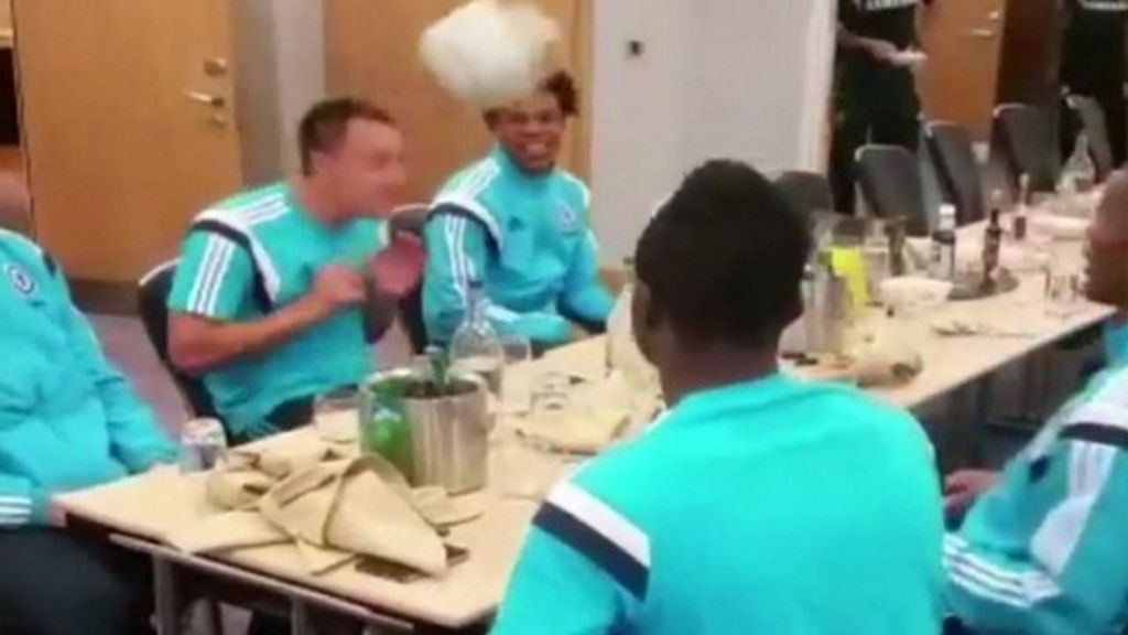 Chelsea stars including John Terry have been filmed performing a head tennis trick at the dinner table.