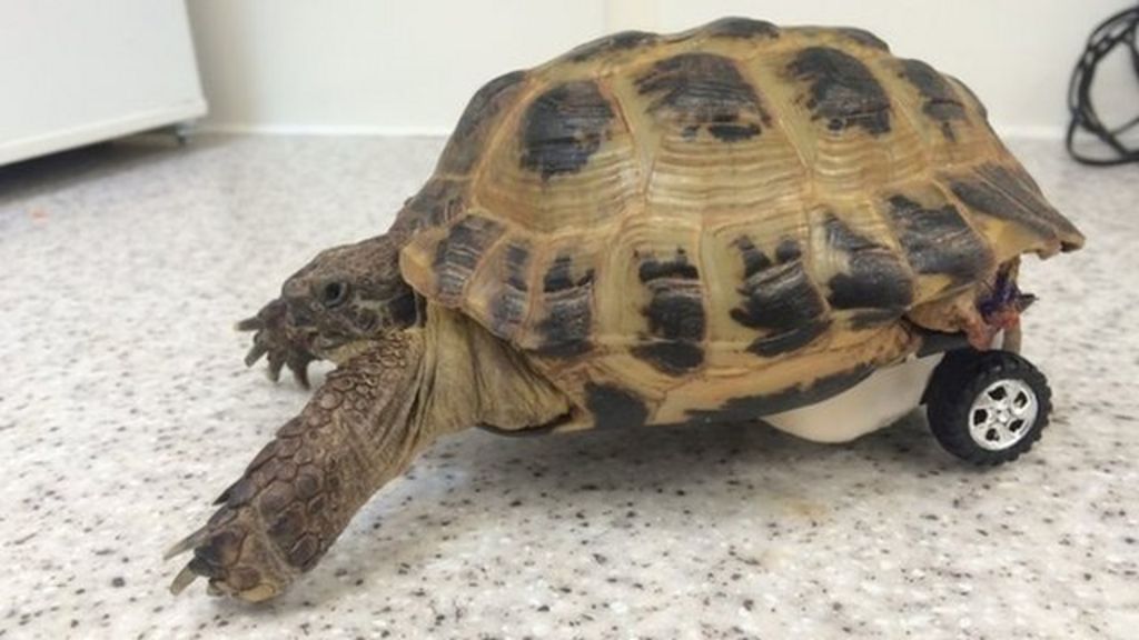 Part of a toy car has been fitted to a tortoise to help it get around after losing a leg.