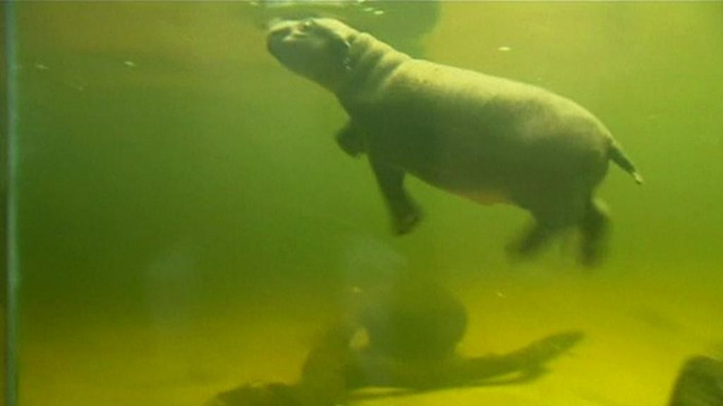 A pygmy hippopotamus calf has taken to the water for the first time with his mother at Melbourne Zoo in Australia.