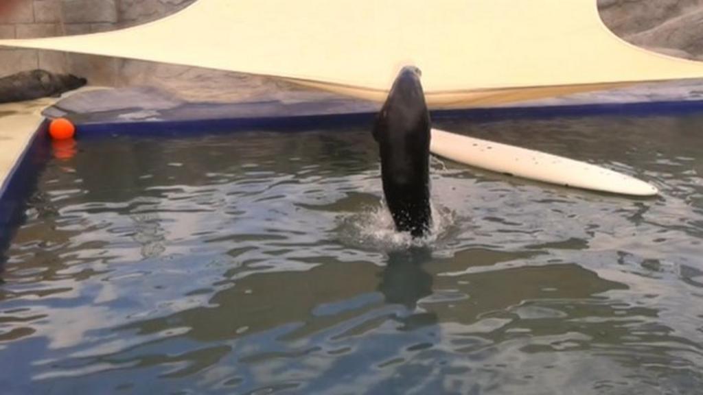 Pumpkin the grey seal has learned to jump out of the water and land on the canopy, where he rolls around sunbathing.