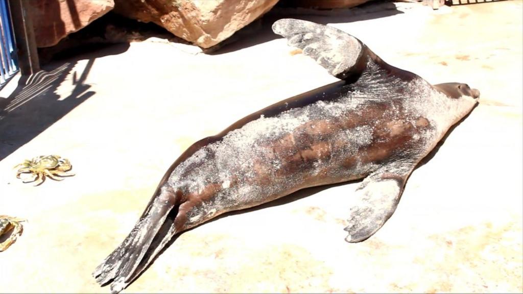 This sea lion protects his skin from the sun's rays by rolling in sand.