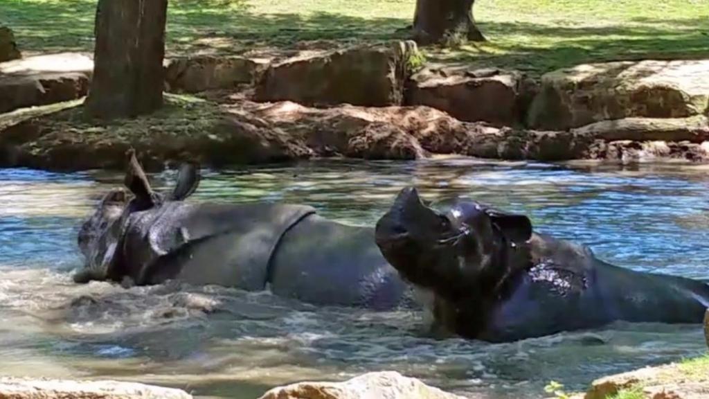 One-horned rhinos at Chester Zoo have been wallowing in a cool pool to help them cope with the heat.