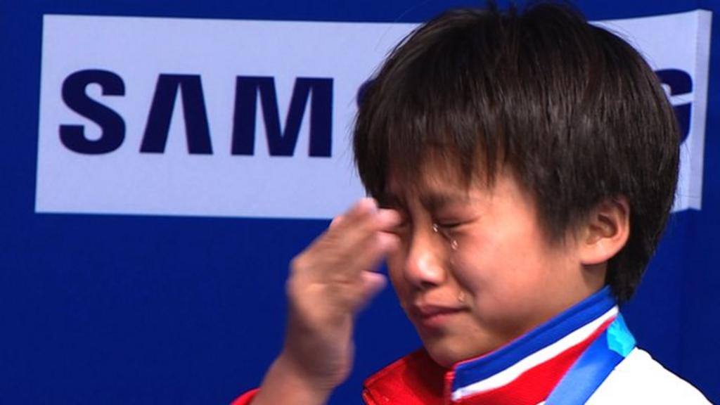 Sixteen-year-old Kim Kuk Hyang bursts into tears as she collects gold for the women's 10m platform at the World Championships in Kazan, Russia.