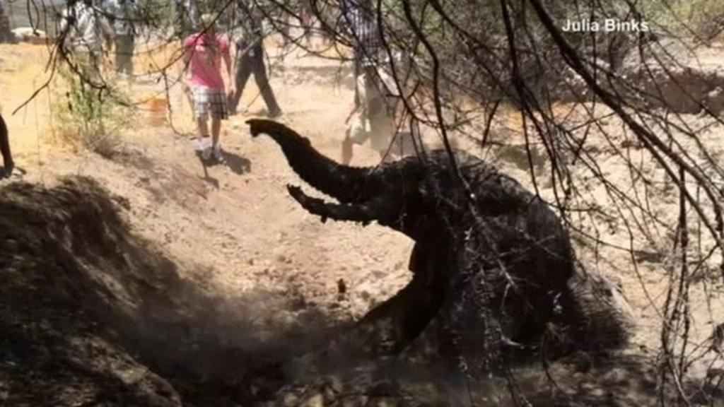 The team shovelled dirt onto the mud to make it drier, and then used ropes attached to three cars to pull the elephant free.