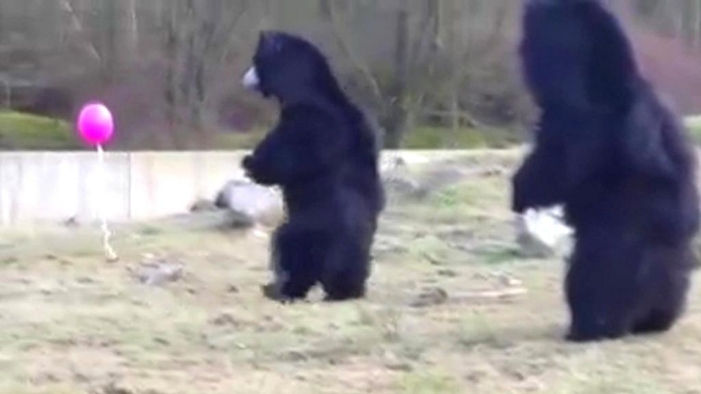 When a stray pink balloon drifted into the sloth bear enclosure at a zoo in the Netherlands the curious bears there saw it as a great opportunity to play.