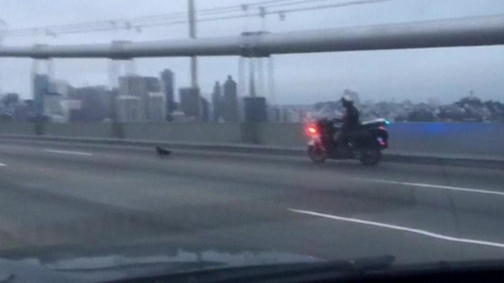This little Chihuahua was trailed by a patrol officer on a motorbike across California's Bay Bridge in the US.