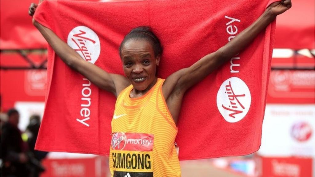 Jemima Sumgong won the elite women's race in the London marathon, despite falling over.