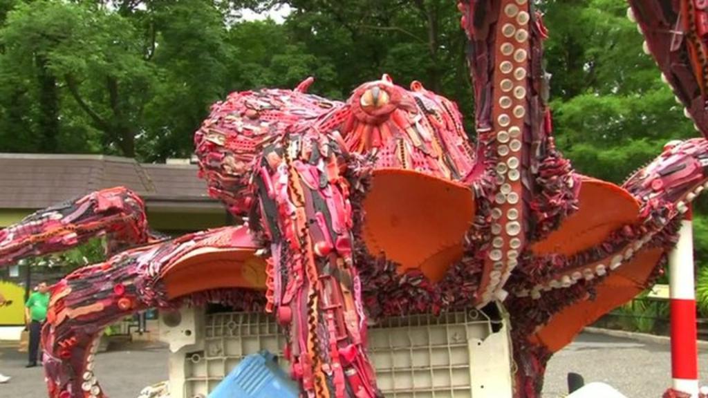 They wash and sort the the plastic items that have come ashore and use them to create sculptures of marine life.